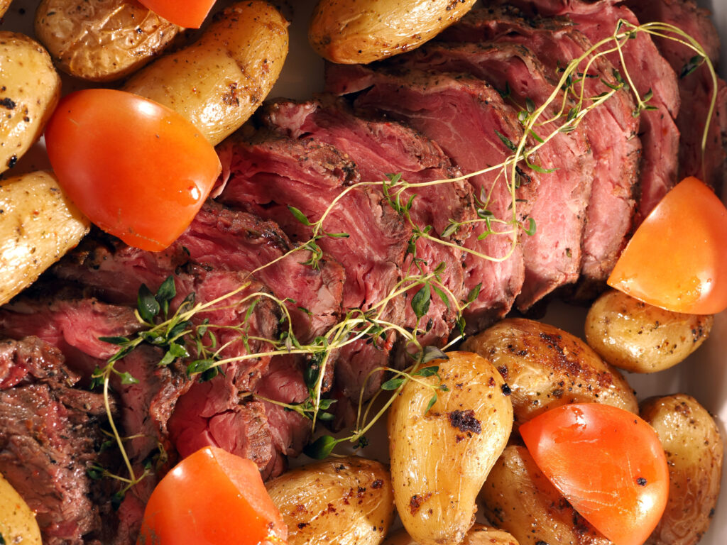Rødvinsmarinert oksefilet med portobellosopp, sesongens grønnsaker, jordskokkpuré, timiansaus og stekte poteter